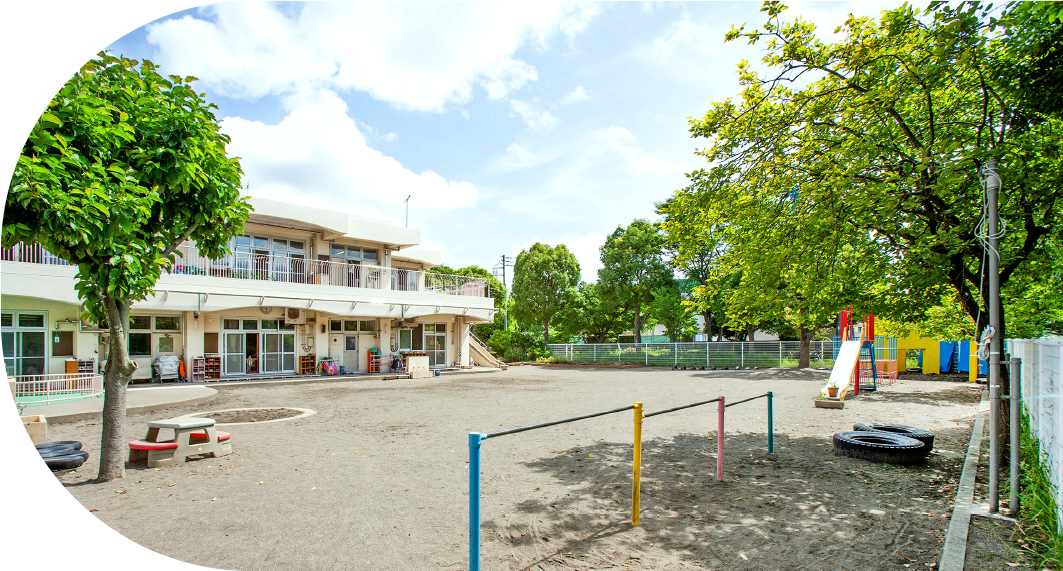 樹木に囲まれた広々とした園庭。砂場や遊具、プールやビオトープ、畑などがあり、さまざまな外遊びが楽しめます!