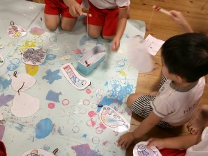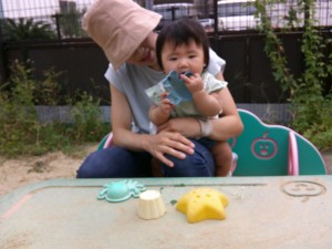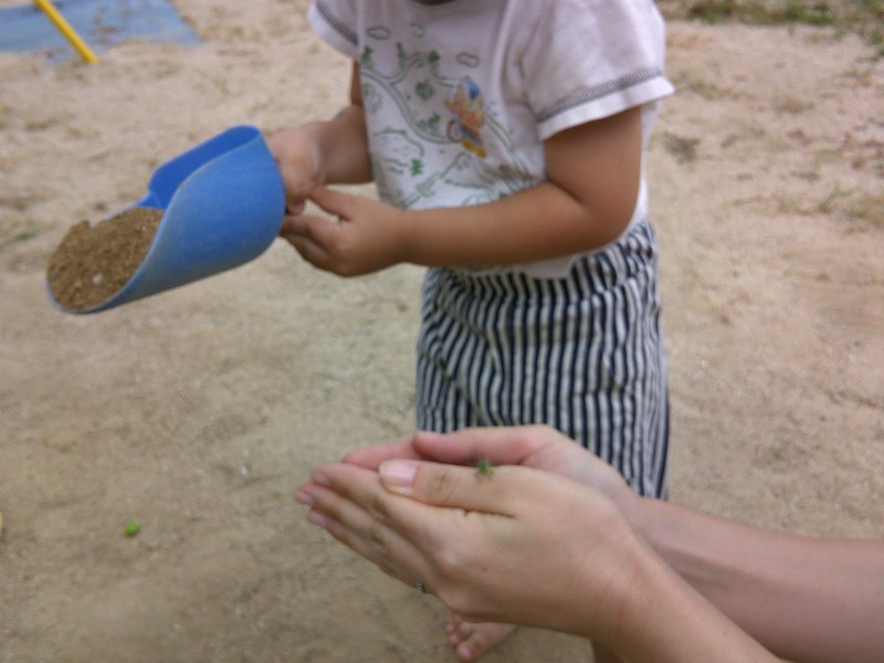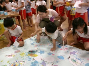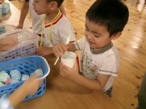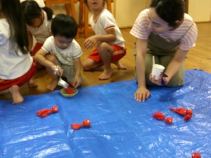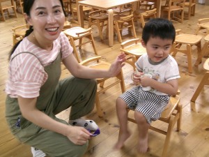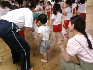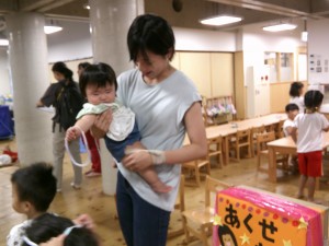 2組の親子が参加してくださいました。気候もよく、園庭で砂遊び。はじめてはだしでお砂の上に…感触はどうだったかな?滑り台をしていると、2歳の園児が、ぬたくりで全身、ピンク色になって近づいてくれました。10時から、幼児さんがそれぞれ屋台のお店屋さんになって、お祭りをたのしむ会に参加させてもらいました。魚釣り、アクセサリー、ジュース、くじびき、金魚すくいなどなど…フィナーレは、ぼんおどりとおみこしです。大盛り上がりでした。