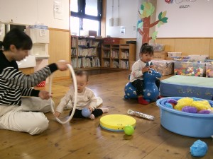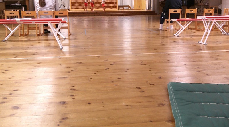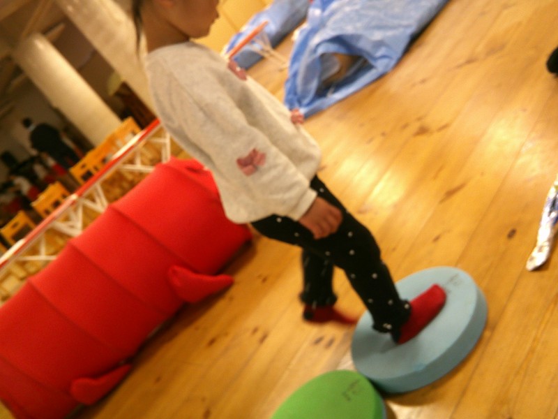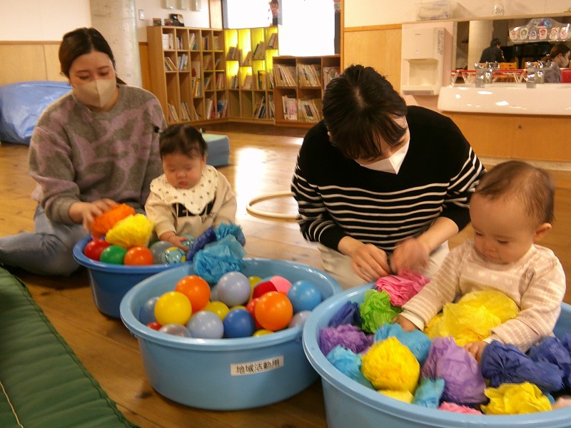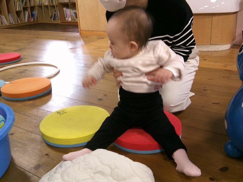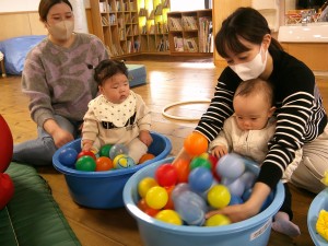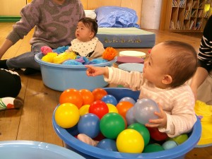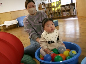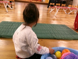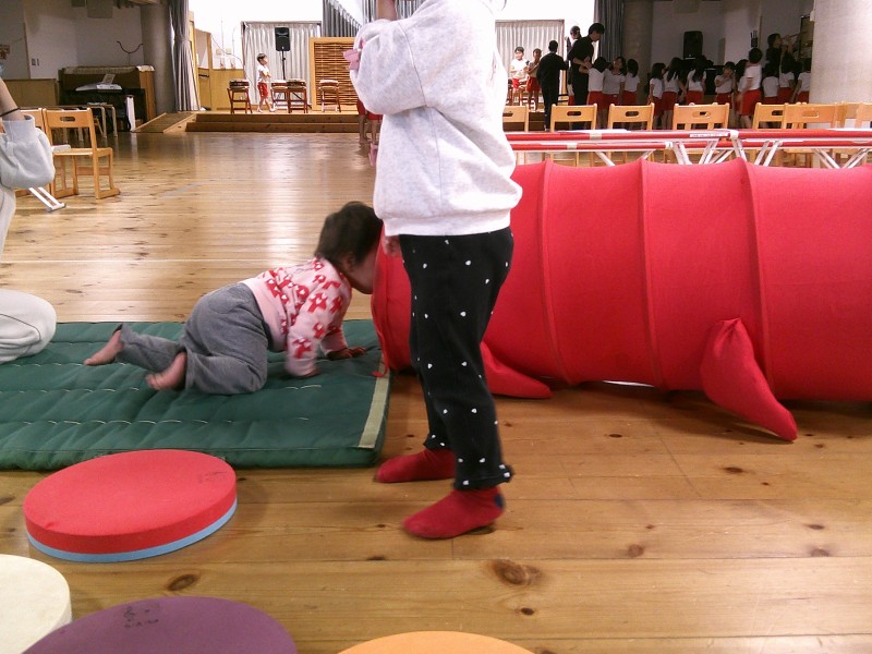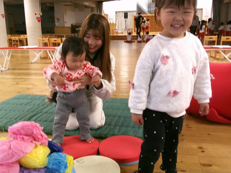 本日はホールで年長さんの生活発表会のれーは―サルを見学したり、ボールプールやマット遊びをしました。