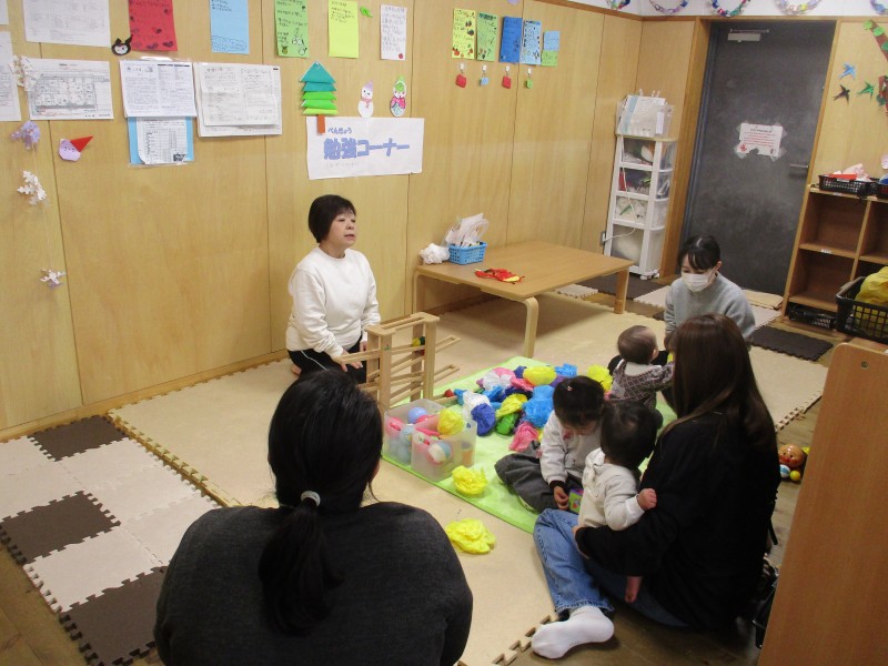 園内のホールでは3・4歳児さんがパラバルーンの練習をしていたので、外からみんなで見学しました。