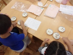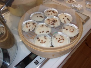 袋の中でもみもみした生地をアルミカップにしぼり、ココアで上手にお絵描きして蒸し上げました。