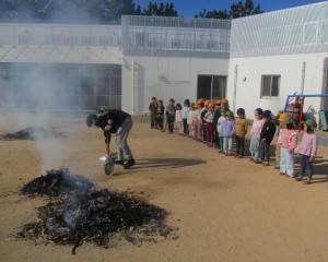 園庭へ出るとたくさんの煙や