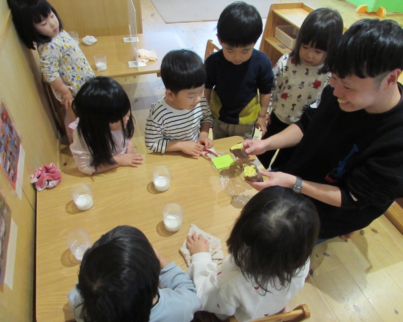 乳児クラスでも先生と一緒に芋を
