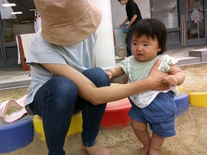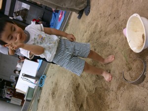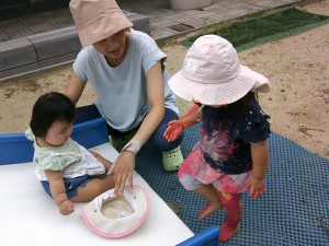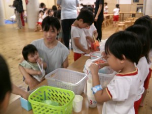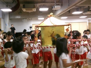 2組の親子が参加してくださいました。気候もよく、園庭で砂遊び。はじめてはだしでお砂の上に…感触はどうだったかな?滑り台をしていると、2歳の園児が、ぬたくりで全身、ピンク色になって近づいてくれました。10時から、幼児さんがそれぞれ屋台のお店屋さんになって、お祭りをたのしむ会に参加させてもらいました。魚釣り、アクセサリー、ジュース、くじびき、金魚すくいなどなど…フィナーレは、ぼんおどりとおみこしです。大盛り上がりでした。
