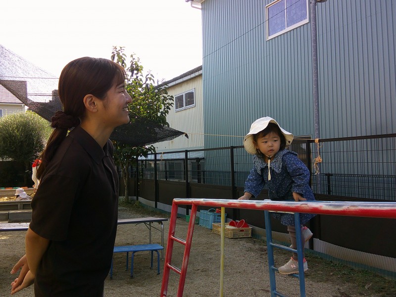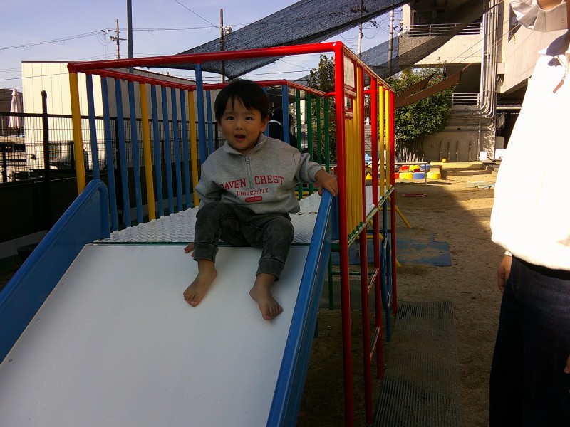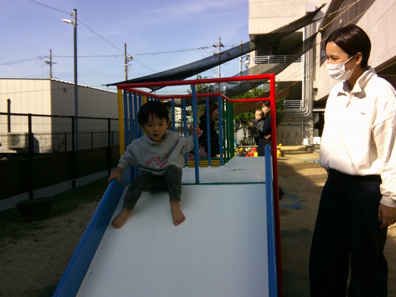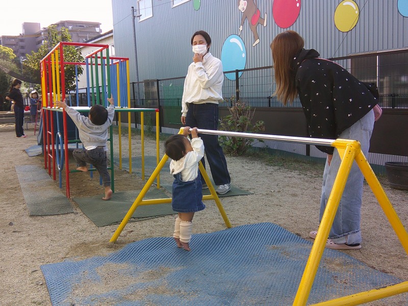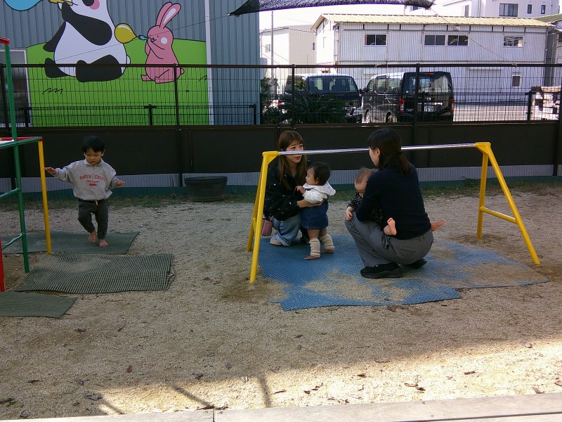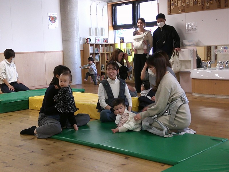9組の親子、お子さま10名(生後3,6,7,8,9,10,か月のお子様、1歳7か月、2歳7か月、お父様)の参加でした。るんびに広場から親子と先生も来ていただきました。前半は、園庭で遊んだり、園内の散策、ホールでは、5歳児が太鼓の練習をしていて、マットなどの遊びをしまがら見たりと、さまざまに過ごしていました。