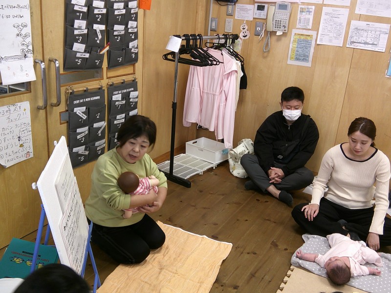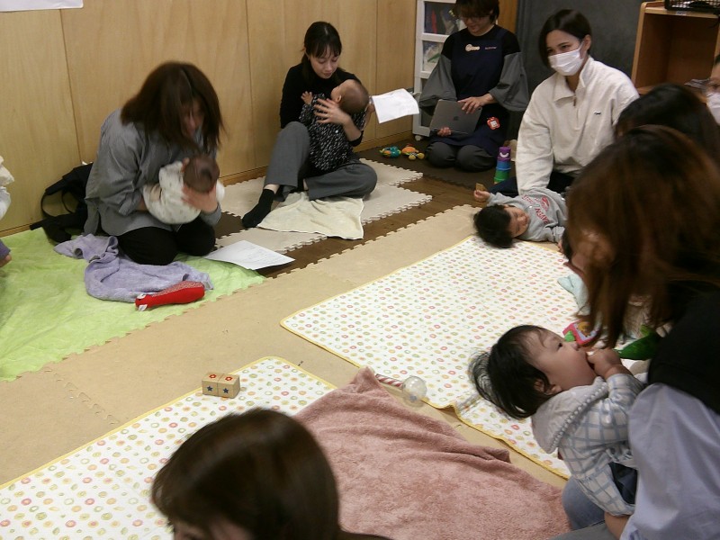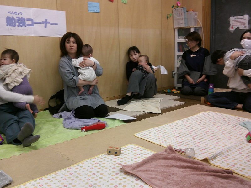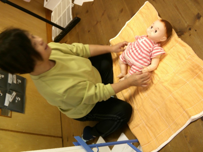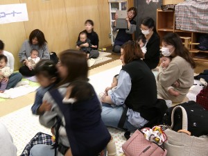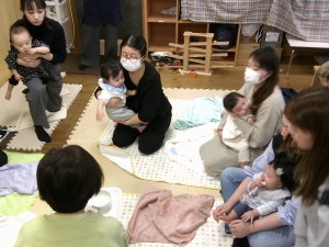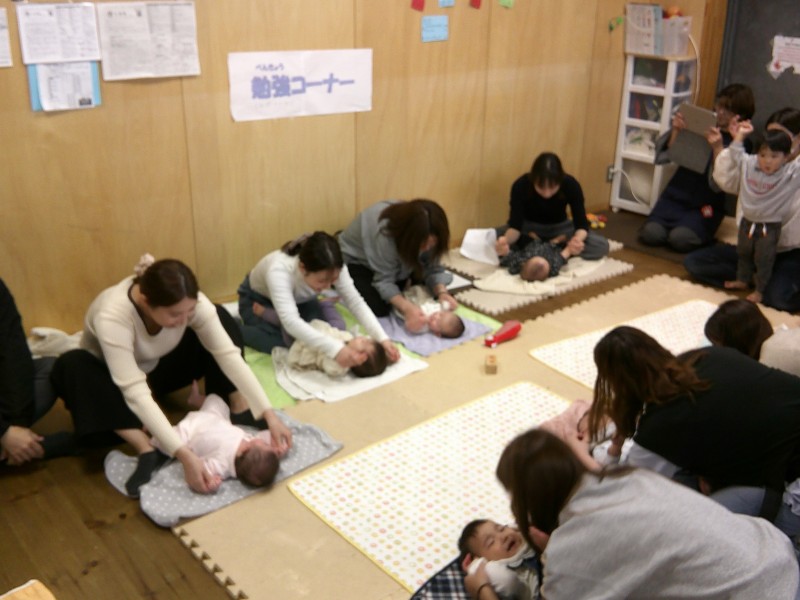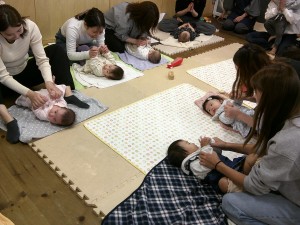 わらべうたベビーマッサージは、昔から受け継がれているマザリーズ(母親語)がふくまれた音符のないラ音多い歌を使用し、マッサージしながら、約1500語以上の言葉のシャワーを子どもに愛情たっぷりにあびせながらおこないます。基本はありますが、難しくなく親と子のコミュニケーションツールで、いろいろアレンジできます。今回もとてもあたたかな空気と、お母さまのこどもへのやさしい愛おしい声が心地よく流れていました。