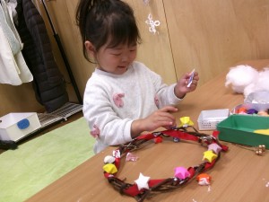 遊んだ後はクリスマスリース作り。色んなアイデアを出しながら可愛いツリーが出来ていました。