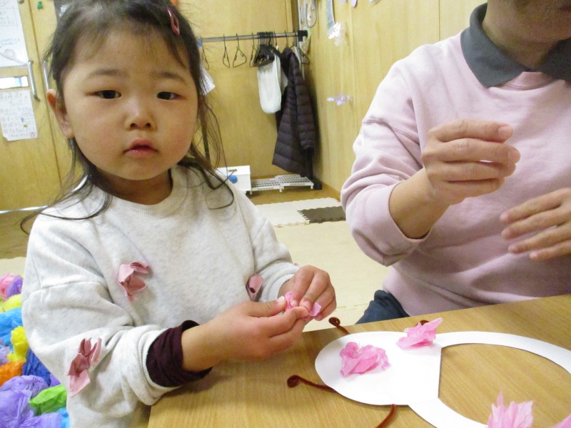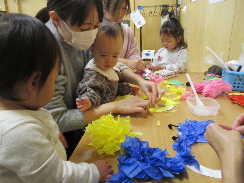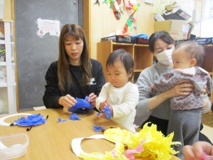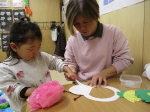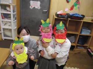 お部屋では、鬼のお面作り。好きな色の鬼を作り、とっても可愛い小鬼に変身どうぞ写真をご覧下さいね。