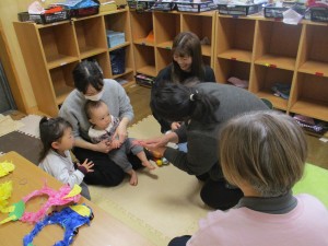 園内のホールでは3・4歳児さんがパラバルーンの練習をしていたので、外からみんなで見学しました。
