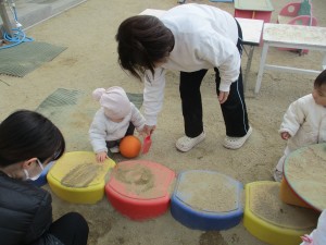 園庭ではアイスクリーム屋さんごっこをしながら、土遊びや、作ってはつぶす(食べる)を繰り返し