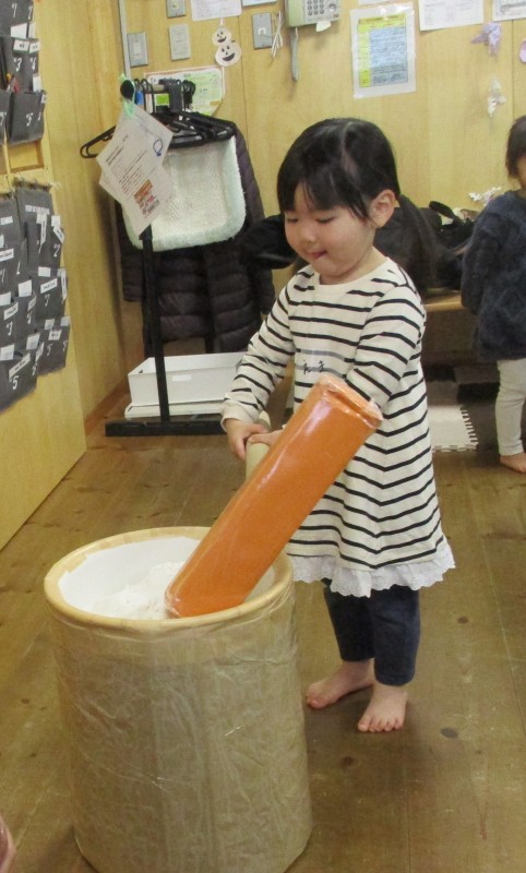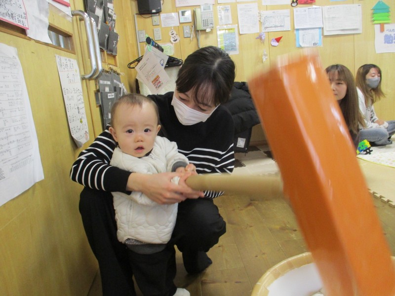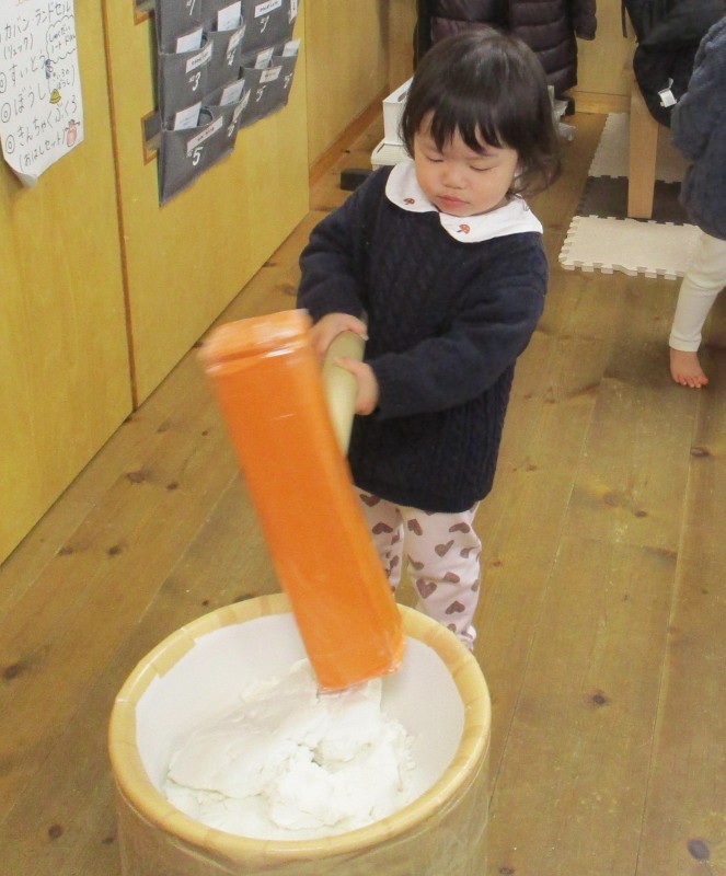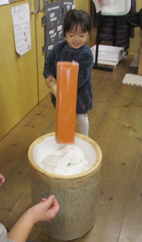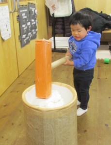 最後は、ミニおもちつき体験を。米粉を練ったものをお持ちに見立て、おもちつきをしました。皆さんとっても上手につけていました。