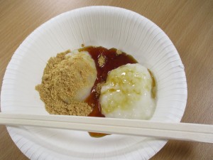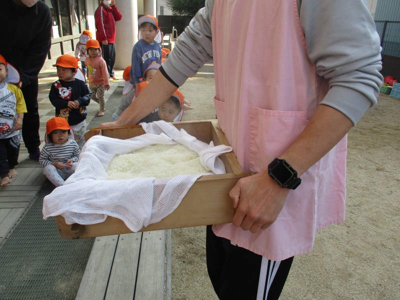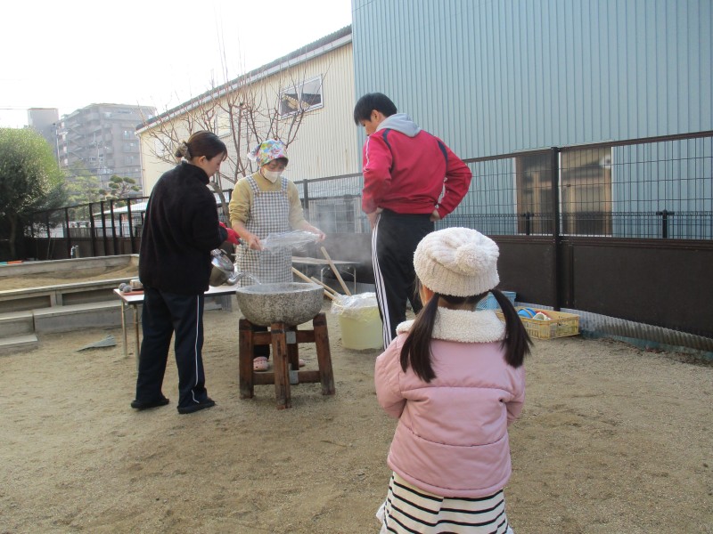 もち米が蒸されるまで園庭で自由に過ごし、もちつきを見学、その後はきな粉とみたらし餡、園のお茶で付きたてのお餅を食べました。