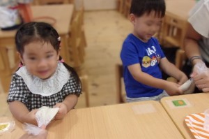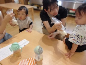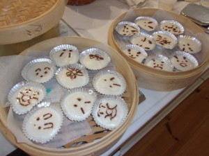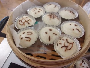 袋の中でもみもみした生地をアルミカップにしぼり、ココアで上手にお絵描きして蒸し上げました。