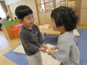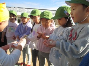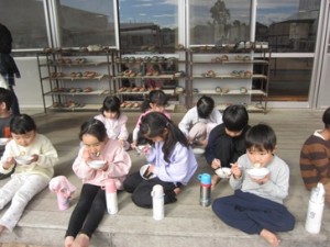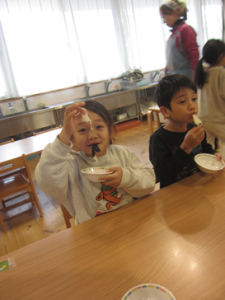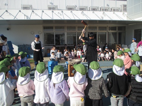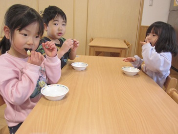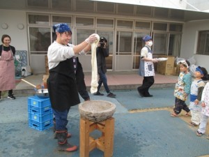 5歳児は実際に杵を使って自分たちでお餅をつき、出来たてのお餅を食べました。のり醤油・きな粉・雑煮の3種類