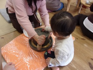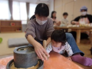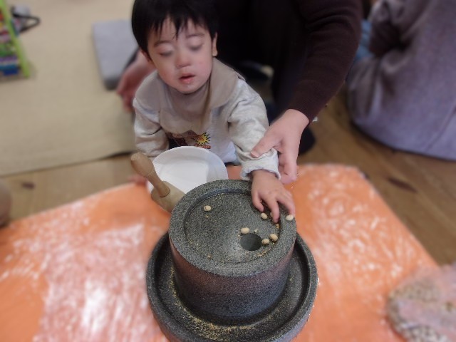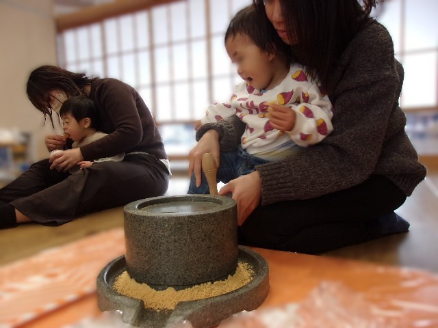 節分のお豆さんを石臼ですり、きな粉を作るところから親子で体験してもらいしました。